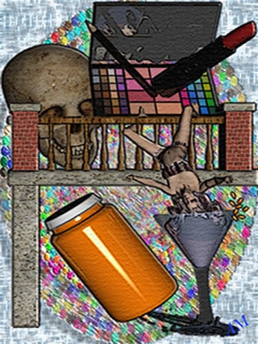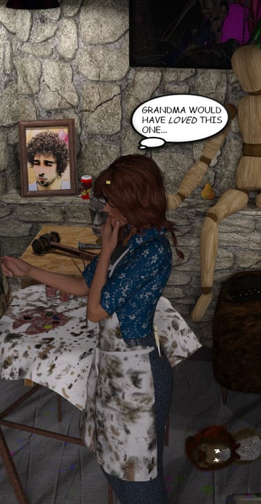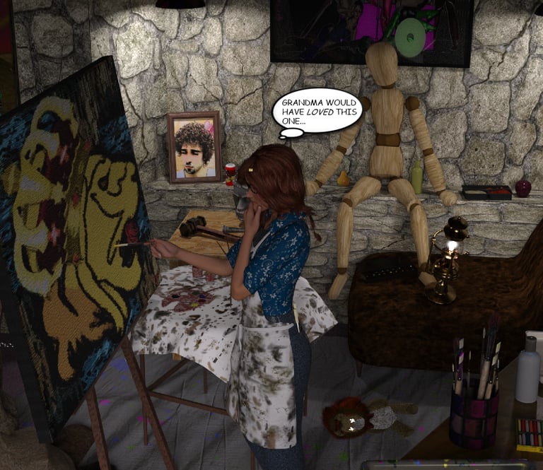 Her art tends to lean toward the darkly macabre and mildly violent. She sees painting as a wonderful way to relieve stress and escape from herself. It is ideally suited for her frenemy Velma Vlakvanovich’s pilfered book cover needs, being a hacky romantic horror author.